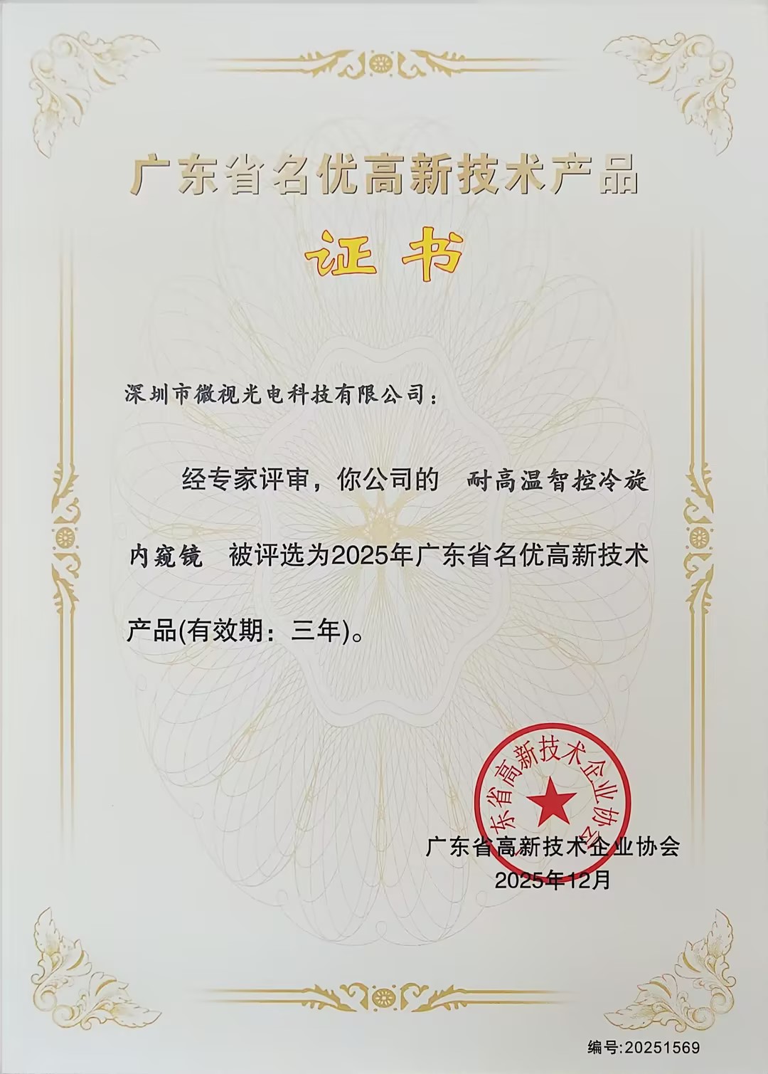 近日,深圳微視三款創(chuàng)新產(chǎn)品:耐高溫智控冷旋內(nèi)窺鏡、0.95mm超細工業(yè)級探視鏡以及360°全向無極擺頭高清視頻內(nèi)窺鏡,均榮獲“2025年廣東省名優(yōu)高新技術(shù)產(chǎn)品”稱號。這一認證不僅是對微視光電技術(shù)實力的高度認可,也標(biāo)志著公司在高新技術(shù)領(lǐng)域的又一重大突破。