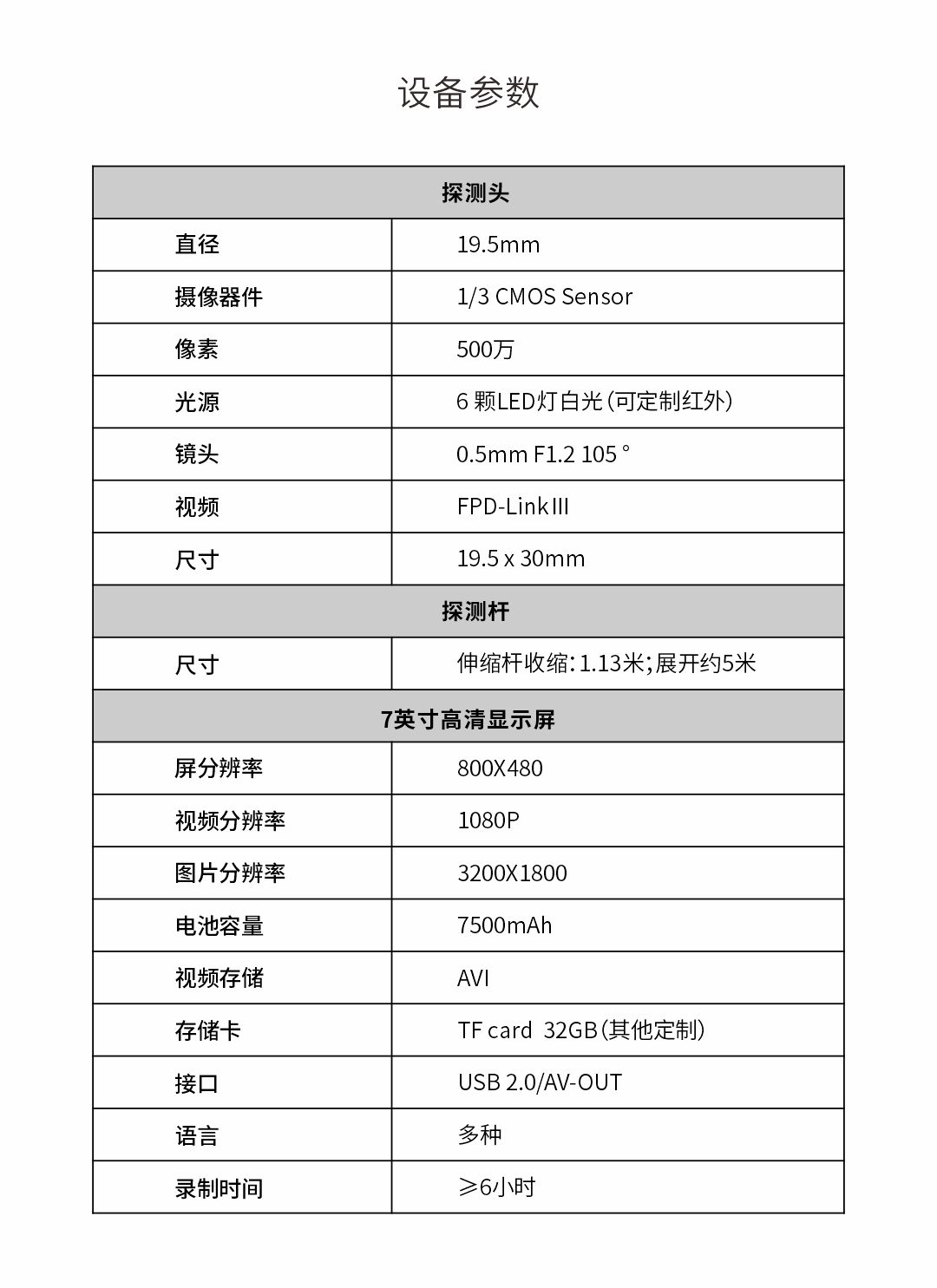 優(yōu)勢(shì)特點(diǎn):500萬(wàn)像素;5米可伸縮調(diào)節(jié)桿;高空檢查專用