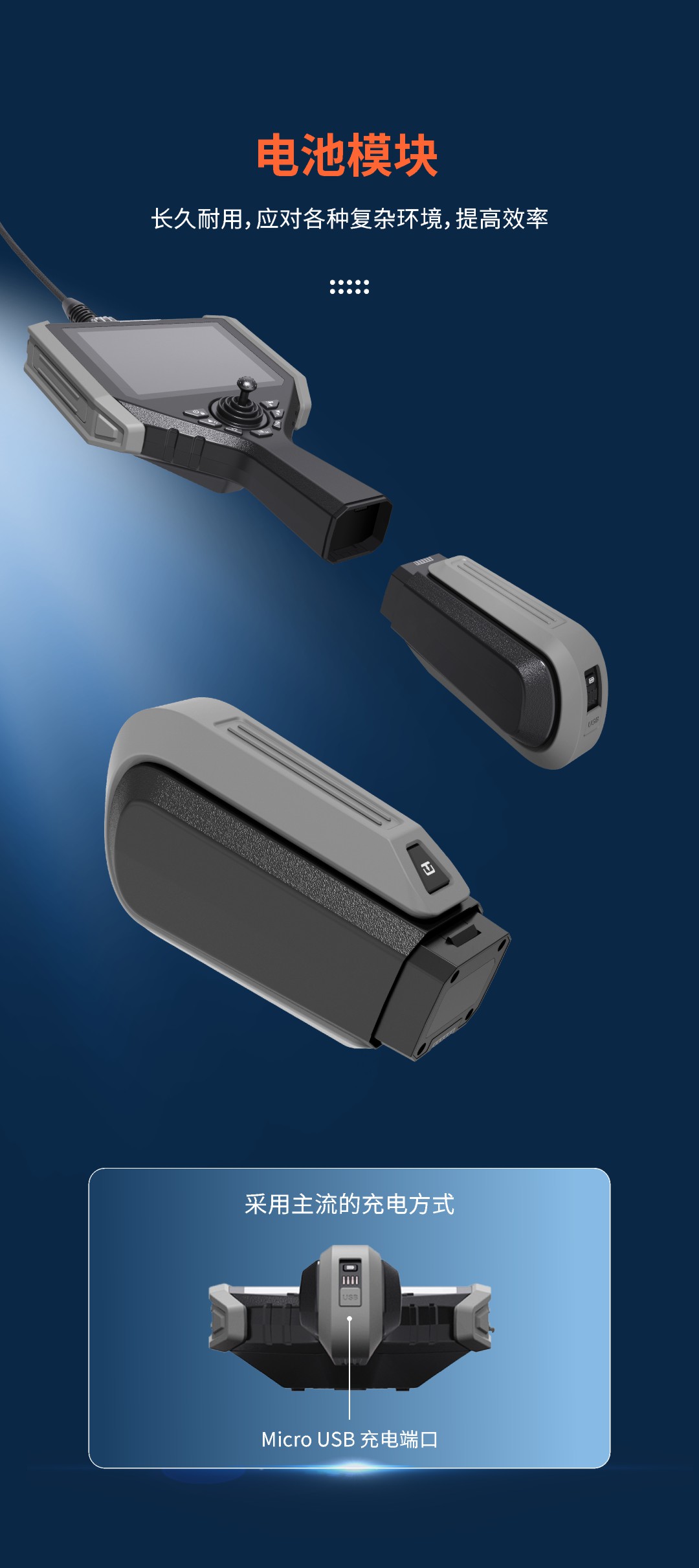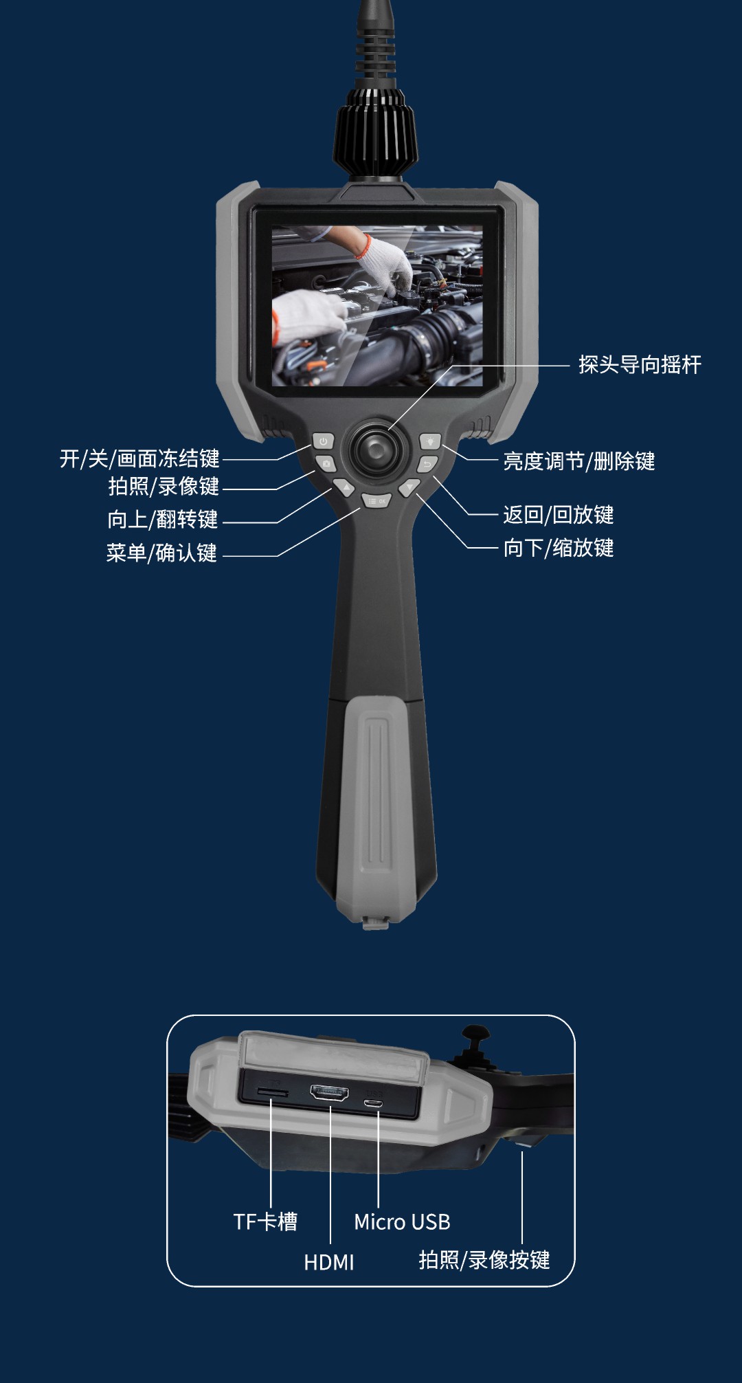 優(yōu)勢特點(diǎn):百萬高清像素,前置高亮燈,快速更換管線,5英寸大屏